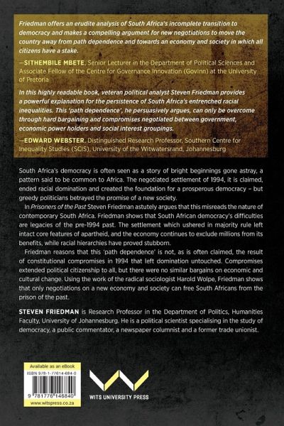 Building on the work of economic historian Douglass North and Ugandan political scholar Mahmood Mamdani, Friedman argues that the difficulties besetting South African democracy are legacies of the past, not products of the post-1994 era South Africa's democracy is often seen as a story of bright beginnings gone astray, a pattern said to be common to Africa. The negotiated settlement of 1994, it is claimed, ended racial domination and created the foundation for a prosperous democracy - but greedy politicians betrayed the promise of a new society. In Prisoners of the Past Steven Friedman astutely argues that this misreads the nature of contemporary South Africa. Building on the work of the economic historian Douglass North and the political thinker Mahmood Mamdani, Friedman shows that South African democracy's difficulties are legacies of the pre-1994 past. The settlement which ushered in majority rule left intact core features of the apartheid economy and society. The economy continues to exclude millions from its benefits, while racial hierarchies have proved stubborn: apartheid is discredited, but the values of the pre-1948 colonial era, the period of British colonization, still dominate. Thus South Africa's democracy supports free elections, civil liberties and the rule of law, but also continues past patterns of exclusion and domination. Friedman reasons that this 'path dependence' is not, as is often claimed, the result of constitutional compromises in 1994 that left domination untouched. This bargain was flawed because it brought not too much compromise, but too little. Compromises extended political citizenship to all but there were no similar bargains on economic and cultural change. Using the work of the radical sociologist Harold Wolpe, Friedman shows that only negotiations on a new economy and society can free South Africans from the prison of the past.