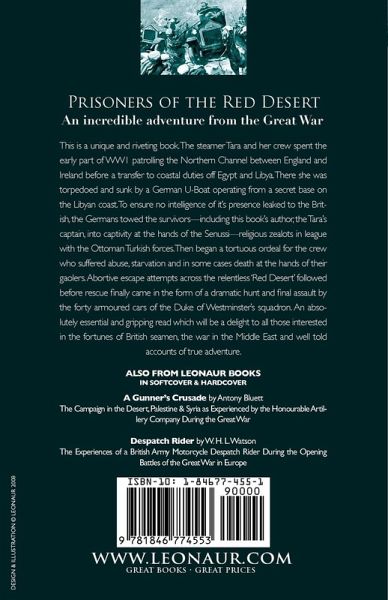 An incredible adventure from the Great War This is a unique and riveting book. The steamer Tara and her crew spent the early part of WW1 patrolling the Northern Channel between England and Ireland before a transfer to coastal duties off Egypt and Libya. There she was torpedoed and sunk by a German U-Boat operating from a secret base on the Libyan coast. To ensure no intelligence of it's presence leaked to the British, the Germans towed the survivors-including this book's author, the Tara's captain, into captivity at the hands of the Senussi-religious zealots in league with the Ottoman Turkish forces. Then began a tortuous ordeal for the crew who suffered abuse, starvation and in some cases death at the hands of their gaolers. Abortive escape attempts across the relentless 'Red Desert' followed before rescue finally came in the form of a dramatic hunt and final assault by the forty armoured cars of the Duke of Westminster's squadron. An absolutely essential and gripping read which will be a delight to all those interested in the fortunes of British seamen, the war in the Middle East and well told accounts of true adventure.