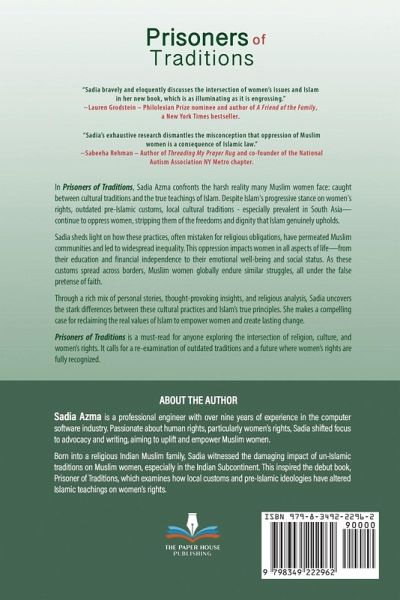 In Prisoners of Traditions, Sadia Azma confronts the harsh reality many Muslim women face: caught between cultural traditions and the true teachings of Islam. Despite Islam's progressive stance on women's rights, outdated pre-Islamic customs, local cultural traditions - especially prevalent in South Asia- continue to oppress women, stripping them of the freedoms and dignity that Islam genuinely upholds. Sadia sheds light on how these practices, often mistaken for religious obligations, have permeated Muslim communities and led to widespread inequality. This oppression impacts women in all aspects of life-from their education and financial independence to their emotional well-being and social status. As these customs spread across borders, Muslim women globally endure similar struggles, all under the false pretense of faith. Through a rich mix of personal stories, thought-provoking insights, and religious analysis, Sadia uncovers the stark differences between these cultural practices and Islam's true principles. She makes a compelling case for reclaiming the real values of Islam to empower women and create lasting change. Prisoners of Traditions is a must-read for anyone exploring the intersection of religion, culture, and women's rights. It calls for a re-examination of outdated traditions and a future where women's rights are fully recognized.