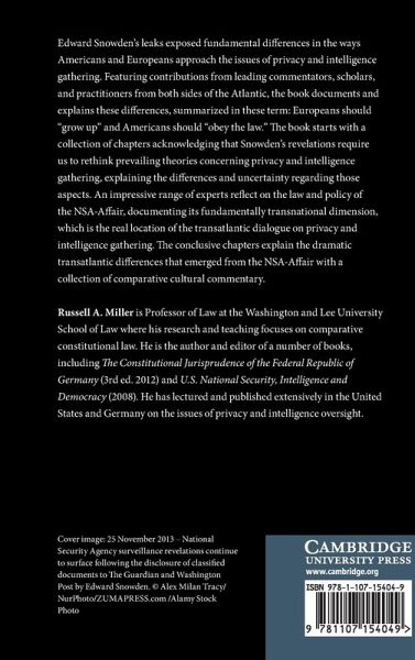 Edward Snowden's leaks exposed fundamental differences in the ways Americans and Europeans approach the issues of privacy and intelligence gathering. Featuring commentary from leading commentators, scholars and practitioners from both sides of the Atlantic, the book documents and explains these differences, summarized in these terms: Europeans should 'grow up' and Americans should 'obey the law'. The book starts with a collection of chapters acknowledging that Snowden's revelations require us to rethink prevailing theories concerning privacy and intelligence gathering, explaining the differences and uncertainty regarding those aspects. An impressive range of experts reflect on the law and policy of the NSA-Affair, documenting its fundamentally transnational dimension, which is the real location of the transatlantic dialogue on privacy and intelligence gathering. The conclusive chapters explain the dramatic transatlantic differences that emerged from the NSA-Affair with a collection of comparative cultural commentary.