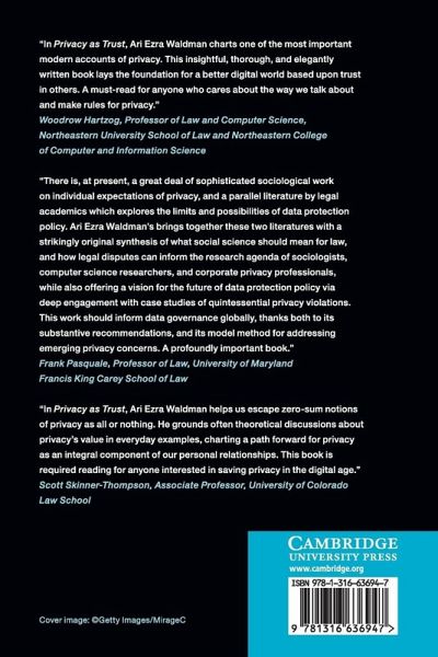 It seems like there is no such thing as privacy anymore. But the truth is that privacy is in danger only because we think about it in narrow, limited, and outdated ways. In this transformative work, Ari Ezra Waldman, leveraging the notion that we share information with others in contexts of trust, offers a roadmap for data privacy that will better protect our information in a digitized world. With case studies involving websites, online harassment, intellectual property, and social robots, Waldman shows how 'privacy as trust' can be applied in the most challenging real-world contexts to make privacy work for all of us. This book should be read by anyone concerned with reshaping the theory and practice of privacy in the modern world.