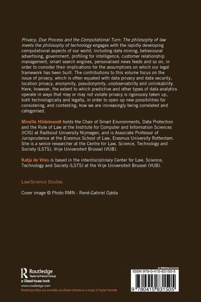 Privacy, Due process and the Computational Turn: The Philosophy of Law Meets the Philosophy of Technology engages with the rapidly developing computational aspects of our world including data mining, behavioural advertising, iGovernment, profiling for intelligence, customer relationship management, smart search engines, personalized news feeds, and so on in order to consider their implications for the assumptions on which our legal framework has been built. The contributions to this volume focus on the issue of privacy, which is often equated with data privacy and data security, location privacy, anonymity, pseudonymity, unobservability, and unlinkability. Here, however, the extent to which predictive and other types of data analytics operate in ways that may or may not violate privacy is rigorously taken up, both technologically and legally, in order to open up new possibilities for considering, and contesting, how we are increasingly being correlated and categorizedin relationship with due process - the right to contest how the profiling systems are categorizing and deciding about us.