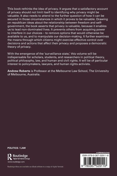This book rethinks the idea of privacy. It argues that a satisfactory account of privacy should not limit itself to identifying why privacy might be valuable. It also needs to attend to the further question of how it can be secured in those circumstances in which it proves to be valuable. Drawing on republican ideas about the relationship between freedom and self-government, the book asserts that privacy is valuable, because it enables us to lead non-dominated lives. It prevents others from acquiring power to interfere in our choices - to remove options that would otherwise be available to us, and to manipulate our decision-making. It further examines the means through which citizens might exercise effective control over decisions and actions that affect their privacy and proposes a democratic theory of privacy.