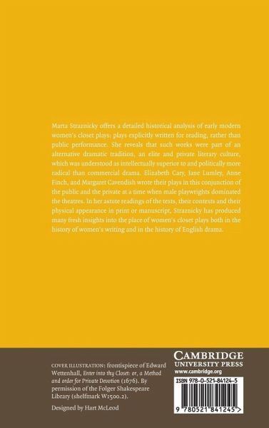 Marta Straznicky offers a detailed historical analysis of early modern women's closet plays: plays explicitly written for reading, rather than public performance. She reveals that such works were part of an alternative dramatic tradition, an elite and private literary culture, which was understood as intellectually superior to and politically more radical than commercial drama. Elizabeth Cary, Jane Lumley, Anne Finch and Margaret Cavendish wrote their plays in this conjunction of the public and the private at a time when male playwrights dominated the theatres. In her astute readings of the texts, their contexts and their physical appearance in print or manuscript, Straznicky has produced many fresh insights into the place of women's closet plays both in the history of women's writing and in the history of English drama.