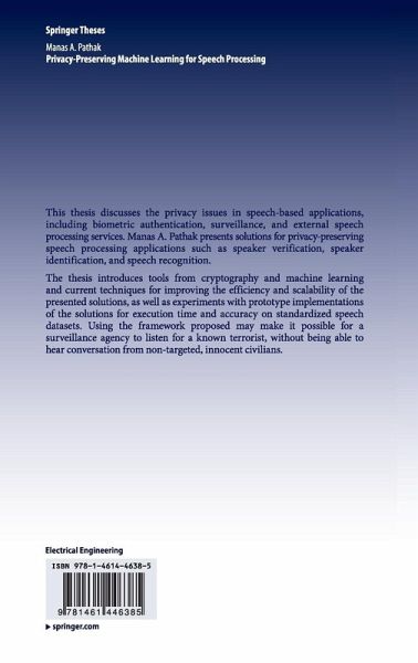 This thesis discusses the privacy issues in speech-based applications such as biometric authentication, surveillance, and external speech processing services. Author Manas A. Pathak presents solutions for privacy-preserving speech processing applications such as speaker verification, speaker identification and speech recognition. The author also introduces some of the tools from cryptography and machine learning and current techniques for improving the efficiency and scalability of the presented solutions. Experiments with prototype implementations of the solutions for execution time and accuracy on standardized speech datasets are also included in the text. Using the framework proposed may now make it possible for a surveillance agency to listen for a known terrorist without being able to hear conversation from non-targeted, innocent civilians.