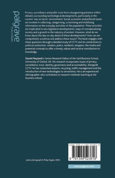 DANIEL NEYLAND is a Senior Research Fellow of the Said Business School, University of Oxford, UK. His research incorporates issues of privacy, surveillance, trust, identity, governance and accountability. Alongside CCTV, he has researched airports, recycling, traffic management and the introduction of new technologies to Universities. He is an experienced ethnographer who contributes to research methods teaching at the Business School. He completed his PhD (1997-2000) at CRICT, Brunel University, UK. He studied for his first degree at Trinity Hall, Cambridge, UK (1993-1996).