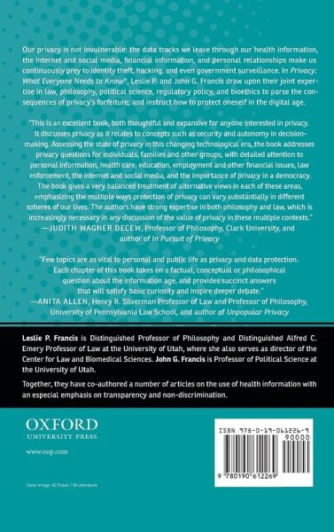 We live more and more of our lives online; we rely on the internet as we work, correspond with friends and loved ones, and go through a multitude of mundane activities like paying bills, streaming videos, reading the news, and listening to music. Without thinking twice, we operate with the understanding that the data that traces these activities will not be abused now or in the future. There is an abstract idea of privacy that we invoke, and, concrete rules about our privacy that we can point to if we are pressed. Nonetheless, too often we are uneasily reminded that our privacy is not invulnerable-the data tracks we leave through our health information, the internet and social media, financial and credit information, personal relationships, and public lives make us continuously prey to identity theft, hacking, and even government surveillance. A great deal is at stake for individuals, groups, and societies if privacy is misunderstood, misdirected, or misused. Popular understanding of privacy doesn't match the heat the concept generates, though understandably. With a host of cultural differences as to how privacy is understood globally and in different religions, and with ceaseless technological advancements, it is an increasingly slippery and complex topic. In this clear and accessible book, Leslie and John G. Francis guide us to an understanding of what privacy can mean and why it is so important. Drawing upon their extensive joint expertise in law, philosophy, political science, regulatory policy, and bioethics, they parse the consequences of the forfeiture, however great or small, of one's privacy.