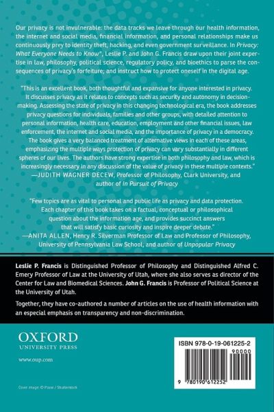 We live more and more of our lives online; we rely on the internet as we work, correspond with friends and loved ones, and go through a multitude of mundane activities like paying bills, streaming videos, reading the news, and listening to music. Without thinking twice, we operate with the understanding that the data that traces these activities will not be abused now or in the future. There is an abstract idea of privacy that we invoke, and, concrete rules about our privacy that we can point to if we are pressed. Nonetheless, too often we are uneasily reminded that our privacy is not invulnerable-the data tracks we leave through our health information, the internet and social media, financial and credit information, personal relationships, and public lives make us continuously prey to identity theft, hacking, and even government surveillance. A great deal is at stake for individuals, groups, and societies if privacy is misunderstood, misdirected, or misused. Popular understanding of privacy doesn't match the heat the concept generates. With a host of cultural differences as to how privacy is understood globally and in different religions, and with ceaseless technological advancements, it is an increasingly complex topic. In this clear and accessible book, Leslie and John G. Francis guide us to an understanding of what privacy can mean and why it is so important. Drawing upon their extensive joint expertise in law, philosophy, political science, regulatory policy, and bioethics, they parse the consequences of the forfeiture, however great or small, of one's privacy.