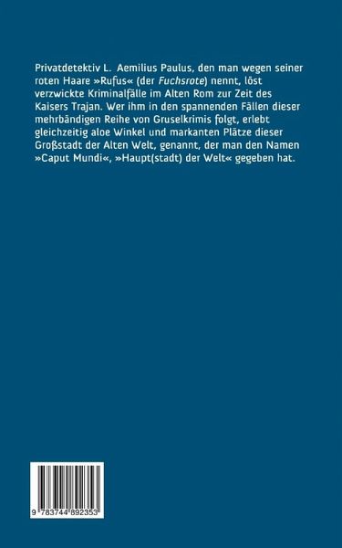 Privatdetektiv L. Aemilius Paulus, den man wegen seiner roten Haare »Rufus« (der Fuchsrote) nennt, löst verzwickte Kriminalfälle im Alten Rom zur Zeit des Kaisers Trajan. Wer ihm in den spannenden Fällen dieser mehrbändigen Reihe von Gruselkrimis folgt, erlebt gleichzeitig alle Winkel und markanten Plätze dieser Großstadt der Alten Welt, der man den Namen »Caput Mundi«, »Haupt(stadt) der Welt« gegeben hat.Ein scheinbar verzwickter Kriminalfall kommt auf Privatdetektiv L. Aemilius Paulus zu, den man wegen seiner roten Haare »Rufus« (der Fuchsrote) nennt: Allem Anschein nach geht hier eine Frau um, die kleinen Kindern das Blut aus den Adern saugt; die Stadtwache von Rom ist überfordert; Rufus widmet sich der Sache, assistiert von seinem Freund Sokrates, einem griechischen Arzt und löst die Gruselgeschichte mit der ihm eigenen Souveränität.Auf der Suche nach dem Killer erleben die drei Freunde eine wahre Mordserie; immer ist ihnen der anonyme Mörder, der sogar einen Rufus in Lebensgefahr bringt, den Verfolgern einen Schritt voraus.Der Autor M.G. Scultetus legt hier einen Gruselkrimi vor, der zugleich eine bittersüße Liebesromanze ist, in deren Mittelpunkt Fabiola steht, eine liebenswürdige und liebesbedürftige Frau in der Mitte des Lebens, voller teilweise verheerender Fehler und Unzulänglichkeiten, äußerlich wie im Charakter, eben eine Süße, mit der man sich identifizieren kann.