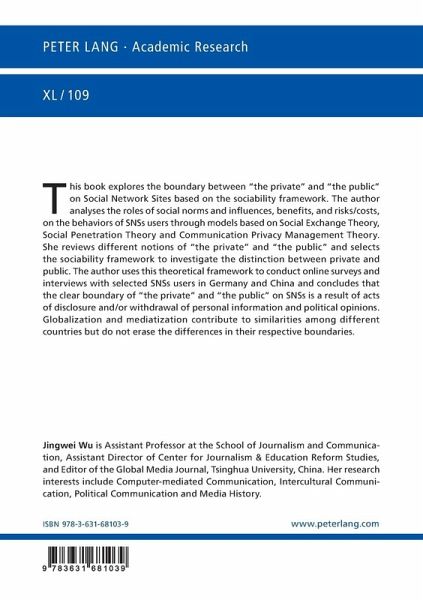 This book explores the boundary between «the private» and «the public» on Social Network Sites based on the sociability framework. The author analyses the roles of social norms and influences, benefits, and risks/costs, on the behaviors of SNSs users through models based on Social Exchange Theory, Social Penetration Theory and Communication Privacy Management Theory. She reviews different notions of «the private» and «the public» and selects the sociability framework to investigate the distinction between private and public. The author uses this theoretical framework to conduct online surveys and interviews with selected SNSs users in Germany and China and concludes that the clear boundary of «the private» and «the public» on SNSs is a result of acts of disclosure and/or withdrawal of personal information and political opinions. Globalization and mediatization contribute to similarities among different countries but do not erase the differences in their respective boundaries.