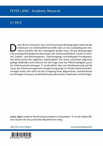 Dieses Buch untersucht, ob es sich bei privaten Betätigungen während der Arbeitszeit um Arbeitspflichtverstöße oder um ein sozialadäquates Verhalten handelt, das der Arbeitgeber dulden muss. Private Betätigungen sind unweigerlich Begleiterscheinungen der Arbeitswirklichkeit. Surfen im Internet, Gebets- und Raucherpausen, Toilettengänge und kollegiale Privatgespräche beherrschen den täglichen Arbeitsablauf. Der Autor entwickelt allgemein gültige Maßstäbe und Kriterien für die Frage nach der Pflichtwidrigkeit privater Arbeitsunterbrechungen. Er verdeutlicht, dass eine Rückbesinnung auf die Causa des Arbeitsvertragsrechts dringend angezeigt ist. Private Arbeitsunterbrechungen lassen sich nicht mit der Erwägung eines allgemeinen, sanktionslosen kurzfristigen Freiraum an Nichtleistung während der Arbeitszeit rechtfertigen.