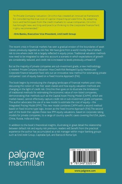 "In Valuing Private Companies, Oricchio has created an innovative framework for considering the true cost of capital impacting private firms. By adapting tools and techniques from the credit markets to value companies, Oricchio has brought new, exciting and practical thinking to the corporate finance field. Highly recommended." Erik Banks, Executive Vice President, UniCredit Group