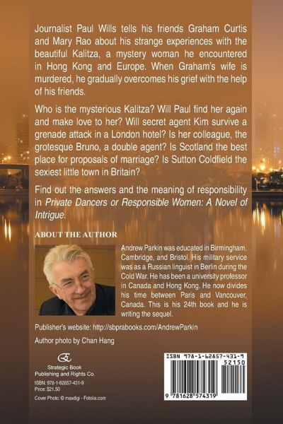 Journalist Paul Wills tells his friends Graham Curtis and Mary Rao about his strange experiences with the beautiful Kalitza, a mystery woman he encountered in Hong Kong and Europe. When Graham's wife is murdered, he gradually overcomes his grief with the help of his friends. Who is the mysterious Kalitza? Will Paul find her again and make love to her? Will secret agent Kim survive a grenade attack in a London hotel? Is her colleague, the grotesque Bruno, a double agent? Is Scotland the best place for proposals of marriage? Is Sutton Coldfield the sexiest little town in Britain? Find out the answers and the meaning of responsibility in Private Dancers or Responsible Women: A Novel of Intrigue. About the Author Andrew Parkin was educated in Birmingham, Cambridge, and Bristol. His military service was as a Russian linguist in Berlin during the Cold War. He has been a university professor in Canada and Hong Kong. He now divides his time between Paris and Vancouver, Canada. This is his 24th book and he is writing the sequel. Publisher's website: http://sbprabooks.com/AndrewParkin