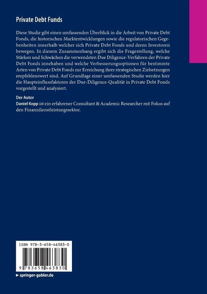 Diese Studie gibt einen umfassenden Überblick in die Arbeit von Private Debt Fonds, die historischen Marktentwicklungen sowie die regulatorischen Gegebenheiten innerhalb welcher sich Private Debt Fonds und deren Investoren bewegen. In diesem Zusammenhang ergibt sich die Fragestellung, welche Stärken und Schwächen die verwendeten Due Diligence-Verfahren der Private Debt Fonds innehaben und welche Verbesserungsoptionen für bestimmte Arten von Private Debt Fonds zur Erreichung ihrer strategischen Zielsetzungen empfehlenswert sind. Auf Grundlage einer umfassenden Studie werden hier die Haupteinflussfaktoren der Due-Diligence-Qualität in Private Debt Fonds vorgestellt und analysiert.