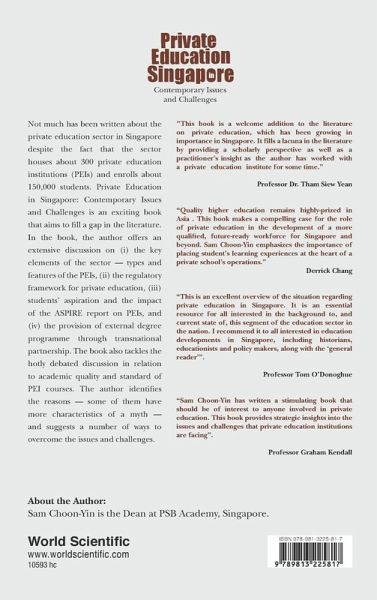 Not much has been written about the private education sector in Singapore despite the fact that the sector houses about 300 private education institutions (PEIs) and enrolls about 150,000 students. Private Education in Singapore: Contemporary Issues and Challenges is an exciting book that aims to fill a gap in the literature. In the book, the author offers an extensive discussion on (i) the key elements of the sector — types and features of the PEIs, (ii) the regulatory framework for private education, (iii) students' aspiration and the impact of the ASPIRE report on PEIs, and (iv) the provision of external degree programme through transnational partnership. The book also tackles the hotly debated discussion in relation to academic quality and standard of PEI courses. The author identifies the reasons — some of them have more characteristics of a myth — and suggests a number of ways to overcome the issues and challenges.