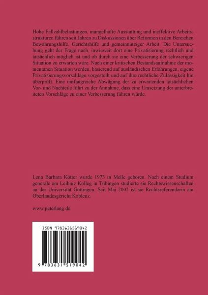 Hohe Fallzahlbelastungen, mangelhafte Ausstattung und ineffektive Arbeitsstrukturen führen seit Jahren zu Diskussionen über Reformen in den Bereichen Bewährungshilfe, Gerichtshilfe und gemeinnütziger Arbeit. Die Untersuchung geht der Frage nach, inwieweit dort eine Privatisierung rechtlich und tatsächlich möglich ist und ob durch sie eine Verbesserung der schwierigen Situation zu erwarten wäre. Nach einer kritischen Bestandsaufnahme der momentanen Situation werden, basierend auf ausländischen Erfahrungen, eigene Privatisierungsvorschläge vorgestellt und auf ihre rechtliche Zulässigkeit hin überprüft. Eine umfangreiche Abwägung der zu erwartenden tatsächlichen Vor- und Nachteile führt zu der Annahme, dass eine Umsetzung der unterbreiteten Vorschläge zu einer Verbesserung führen würde.