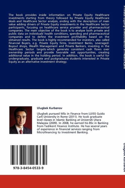 The book provides inside information on Private Equity Healthcare investments starting from theory followed by Private Equity Healthcare deals and Healthcare Sector analysis, ending with the description of main value adding drivers of Private Equity investments in the Healthcare Sector participants, focusing on healthcare service provider and pharmaceutical companies. The main objective of the book is to analyze both private and public data on individuals' health conditions, spending and pharmaceutical companies and to define the investment profitability based on the obtained results. The book is highly recommended for investors, also called Financial Buyers, e.g. Private Equity firms, Investment Banks, Leveraged-Buyout shops, Wealth Management and Private Bankers, investing in the Healthcare Sector targets which generate consistent cash flows over ownership periods and provide favorable exit opportunities, creating additional value in the holding period. In addition, the book isuseful for undergraduate, graduate and postgraduate students interested in Private Equity as an alternative investment strategy.