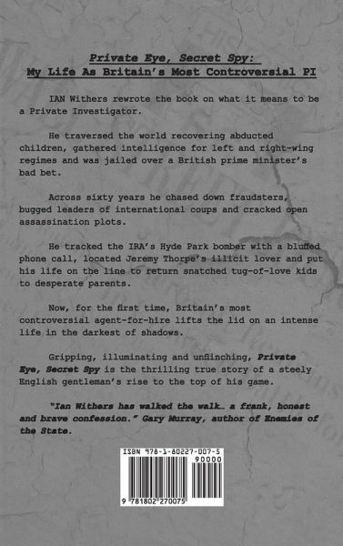 IAN Withers rewrote the book on what it means to be a Private Investigator. He traversed the world recovering abducted children, gathered intelligence for left and right-wing regimes and was jailed over a British prime minister's bad bet. Across sixty years he chased down fraudsters, bugged leaders of international coups and cracked open assassination plots. He tracked the IRA's Hyde Park bomber with a bluffed phone call, located Jeremy Thorpe's illicit lover and put his life on the line to return snatched tug-of-love kids to desperate parents. Now, for the first time, Britain's most controversial agent-for-hire lifts the lid on an intense life in the darkest of shadows. Gripping, illuminating and unflinching, Private Eye, Secret Spy is the thrilling true story of a steely English gentleman's rise to the top of his game. "Ian Withers has walked the walk... a frank, honest and brave confession." Gary Murray, author of Enemies of the State.