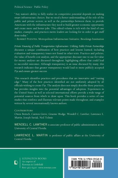 This book examines the challenges faced by public officials and stakeholders as they implement public-private partnerships as a way of financing repair and construction of transportation infrastructure. Concepts and practices are described, along with analysis that points to the advantages and disadvantages of decisions to be adopted.