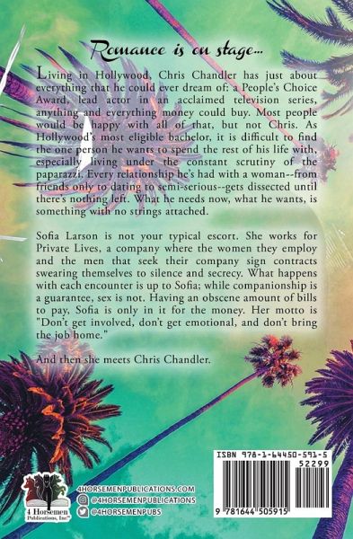 Living in Hollywood, Chris Chandler has just about everything that he could ever dream of: a People's Choice Award, lead actor in an acclaimed television series, anything and everything money could buy. Most people would be happy with all of that, but not Chris. As Hollywood's most eligible bachelor, it is difficult to find the one person he wants to spend the rest of his life with, especially living under the constant scrutiny of the paparazzi. Every relationship he's had with a woman--from friends only to dating to semi-serious--gets dissected until there's nothing left. What he needs now, what he wants, is something with no strings attached. Sofia Larson is not your typical escort. She works for Private Lives, a company where the women they employ and the men that seek their company sign contracts, swearing themselves to silence and secrecy. What happens with each encounter is up to Sofia; while companionship is a guarantee, sex is not. Having an obscene amount of bills to pay, Sofia is only in it for the money. Her motto is "Don't get involved, don't get emotional, and don't bring the job home." And then she meets Chris Chandler.