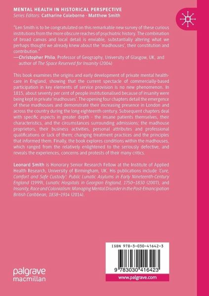 This book examines the origins and early development of private mental health-care in England, showing that the current spectacle of commercially-based participation in key elements of service provision is no new phenomenon. In 1815, about seventy per cent of people institutionalised because of insanity were being kept in private 'madhouses'. The opening four chapters detail the emergence of these madhouses and demonstrate their increasing presence in London and across the country during the long eighteenth century. Subsequent chapters deal with specific aspects in greater depth - the insane patients themselves, their characteristics, and the circumstances surrounding admissions; the madhouse proprietors, their business activities, personal attributes and professional qualifications or lack of them; changing treatment practices and the principles that informed them. Finally, the book explores conditions within the madhouses, which ranged from the relatively enlightened to theseriously defective, and reveals the experiences, concerns and protests of their many critics.
