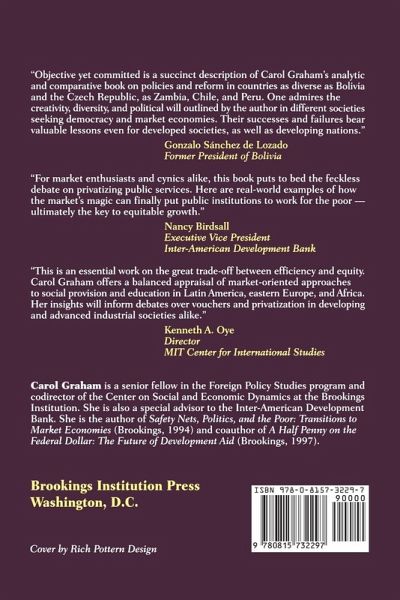 " This book studies the effects of incorporating market incentives into the public goods arena. Carol Graham examines the effects of market-based strategies on the performance of public institutions, the political sustainability of market reforms, and equity. In so doing, she examines a variety of reform experiences in the realms of education, health, social security, and state- owned enterprises and across a range of country and income contexts, with case studies drawn from Latin America, Africa, and Eastern Europe. The studies show that the incorporation of new market incentives, such as vouchers in education and private social security systems, can have positive effects on the performance of public institutions. The effects on equity are less clear, however, and in many cases efficiency gains entail short-term equity losses. The poorest sectors are usually least equipped to take advantage of new incentives and may be marginalized from the reforms and lose access to essential services. Yet in the long-term, negative equity effects are usually counter-balanced by the benefits of enhancing the performance of public institutions. As this book makes clear, the issues explored have relevance for advanced industrial societies as well as for developing economies."