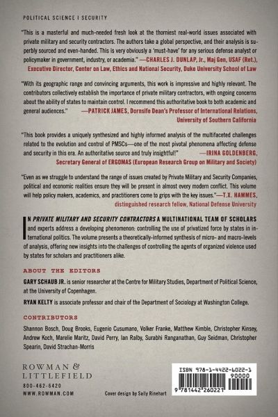 Editors Gary Schaub, Jr. is a senior researcher at the Centre for Military Studies, Department of Political Science, at the University of Copenhagen. Ryan Kelty is an associate professor and Chair of the Department of Sociology at Washington College. Contributors Shannon Bosch is an admitted attorney and senior lecturer at the University of Kwa Zulu-Natal, Law School in South Africa. Doug Brooks is president emeritus of the International Stability Operations Association (ISOA). Eugenio Cusumano is a lecturer in International Relations at the Baltic Defence College. Volker Franke is an associate professor of Conflict Management at Kennesaw State University. Matthew Kimble is a candidate attorney at Stirling Attorneys in Durban, South Africa. Christopher Kinsey is a reader in Business and International Security in the Defence Studies Department at King's College London. Andrew N. Koch is a MA Candidate at The Fletcher School of Law and Diplomacy of Tufts University. Marelie Maritz holds an LLB LLM (cum laude specializing in International Law) from the University of Pretoria, South Africa. David Perry is the senior analyst and a fellow with the Canadian Global Affairs Institute. Ian M. Ralby is founder and executive director of I.R. Consilium and is adjunct professor of Maritime Law and Security at the Africa Center for Strategic Studies at National Defense University in Washington, DC, as well as a retained expert for both the United Nations and NATO. Surabhi Ranganathan is assistant professor at Warwick University. Guy Seidman is a professor and head of the LL.M. program at the Radzyner School of Law. Christopher Spearin is an associate professor in the department of defence studies of the Royal. Military College of Canada. David Strachan-Morris is a lecturer in Intelligence and Security in the Department of Politics & International Relations at the University of Leicester.