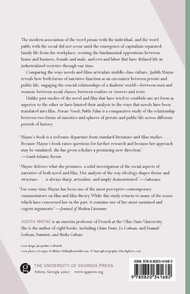 The modern association of the word private with the individual, and the word public with the social did not occur until the emergence of capitalism separated family life from the workplace, creating the fundamental oppositions between home and business, female and male, and rest and labor that have defined life in industrialized societies through our time. Comparing the ways novels and films articulate middle-class culture, Judith Mayne reveals how both forms of narrative function as an encounter between private and public life, engaging the crucial relationships of a dualistic world--between men and women; between social classes; between readers or viewers and texts. Unlike past studies of the novel and film that have tried to establish one art form as superior to the other or have limited their analysis to the ways that novels have been translated into film, Private Novels, Public Films is a comparative study of the relationship between two forms of narrative and spheres of private and public life across different periods of history.