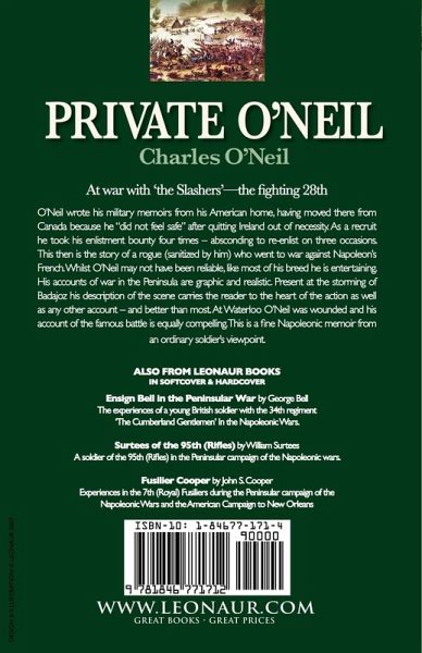Private O'Neil: the Recollections of an Irish Rogue of H. M. 28th Regt.-the Slashers-During the Peninsula & Waterloo Campaigns of the Napoleonic Wars At war with 'the Slashers'-the fighting 28th O'Neil wrote his military memoirs from his American home, having moved there from Canada because he "did not feel safe" after quitting Ireland out of necessity. As a recruit he took his enlistment bounty four times - absconding to re-enlist on three occasions. This then is the story of a rogue (sanitized by him) who went to war against Napoleon's French. Whilst O'Neil may not have been reliable, like most of his breed he is entertaining. His accounts of war in the Peninsula are graphic and realistic. Present at the storming of Badajoz his description of the scene carries the reader to the heart of the action as well as any other account - and better than most. At Waterloo O'Neil was wounded and his account of the famous battle is equally compelling. This is a fine Napoleonic memoir from an ordinary soldier's viewpoint.
