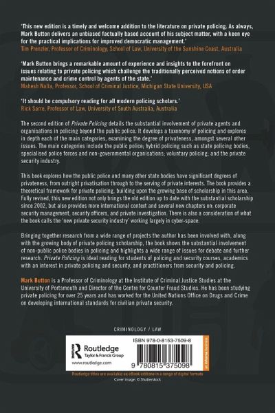 "It is now a truism of policing studies that private security has eclipsed conventional public-sector police services in scope and influence. For example, much of the long-term reduction in crime rates internationally has been attributed to the work of the expanding industry, and security processes are now deeply embedded in all aspects of everyday life. It is also a truism that the field is under-researched and that government policy in the area has generally not been well-informed by the available science. From this perspective, this new edition is a very timely and welcome addition to the literature on private policing. As always, Mark Button delivers an unbiased factually-based account of his subject matter, with a keen eye for the practical implications for improved democratic management."