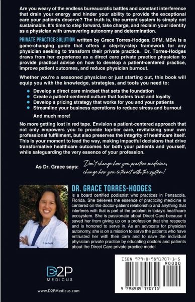 Is the constant battle with bureaucracies and the suffocating grip of third-party interference leaving you drained and unable to deliver the exceptional care your patients deserve? It's time to break those chains and reclaim your professional autonomy as a physician with unwavering determination. Say goodbye to bureaucratic headaches and create a patient-centric approach that places you firmly in the driver's seat. Private Practice Solution is not your average book; it's a powerful guide designed to empower physicians like you to seize control of your destiny. This book is your key to unlocking professional freedom and unparalleled success in the ever-changing landscape of healthcare. Dr. Grace Torres-Hodges not only shares her transformative experience, but she also offers priceless insights that go beyond mere instruction. With her expert guidance, you'll be empowered to carve your own unique path to success. By embracing a Direct Care mindset, you will be able to regain absolute control over your practice and provide unmatched patient care. Don't waste any more time in a broken system! Whether you're a seasoned physician or just starting out, this book will equip you with the knowledge, strategies, and tools you need to :Develop a direct care mindset that sets the foundation Create a patient-centered culture that fosters trust and loyalty Develop a pricing strategy that works for you and your patients Streamline your business operations to reduce stress and burnout Your patients - as well as your family - need you! Reclaim the joy of practicing medicine on your own terms and see your patients thrive in response to your patient-centered approach. Seize the power that is at hand! As Dr. Grace says, "Don't change how you practice medicine, change how you interact with the system!"