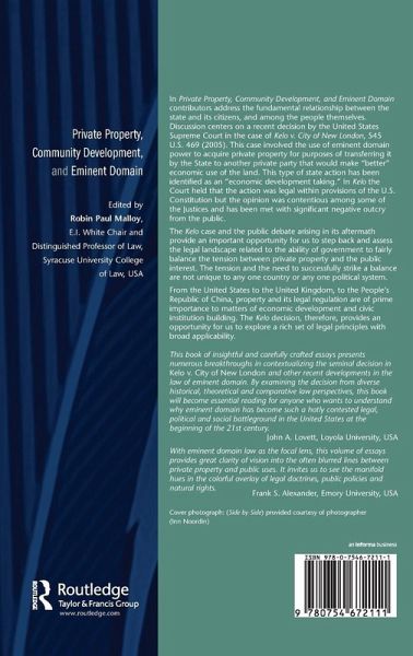The contributors in this volume address the fundamental relationship between the state and its citizens, and among the people themselves. Discussion centers on a recent decision by the United States Supreme Court in the case of Kelo v. City of New London. This case involved the use of eminent domain power to acquire private property for purposes of transferring it by the State to another private party that would make "better" economic use of the land. This type of state action has been identified as an "economic development taking". In the Kelo case, the Court held that the action was legal within provisions of the US Constitution but the opinion was contentious among some of the Justices and has been met with significant negative outcry from the public. The Kelo case and the public debate arising in its aftermath give cause to assess the legal landscape related to the ability of government to fairly balance the tension between private property and the public interest. The tension and the need to successfully strike a balance are not unique to any one country or any one political system. From the United States to the United Kingdom, to the People's Republic of China, property and its legal regulation are of prime importance to matters of economic development and civic institution building. The Kelo decision, therefore, explores a rich set of legal principles with broad applicability.