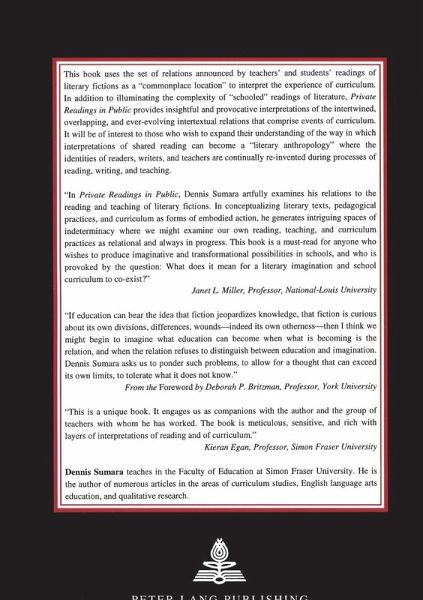 «In 'Private Readings in Public', Dennis Sumara artfully examines his relations to the reading and teaching of literary fictions. In conceptualizing literary texts, pedagogical practices, and curriculum as forms of embodied action, he generates intriguing spaces of indeterminacy where we might examine our own reading, teaching, and curriculum practices as relational and always in progress. This book is a must-read for anyone who wishes to produce imaginative and transformational possibilities in schools, and who is provoked by the question: What does it mean for a literary imagination and school curriculum to co-exist?» (Janet L. Miller, Professor, National-Louis University
