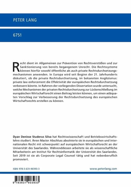 Recht dient im Allgemeinen zur Prävention von Rechtsverstößen und zur Sanktionierung von bereits begangenem Unrecht. Die Rechtssysteme können hierfür sowohl öffentliche als auch private Rechtsdurchsetzungsmechanismen anwenden. In Europa wird seit Beginn der 21. Jahrhunderts diskutiert, ob die private Rechtsdurchsetzung, im bekannten Anglizismus: private law enforcement die Effektivität der europäischen Rechtsdurchsetzung verbessern könnte. In Rahmen der vorliegenden Dissertation wurde untersucht, welche Mechanismen der privaten Rechtsdurchsetzung zur Lückenschließung im europäischen Wirtschaftsrecht einen Beitrag leisten können, um einen adäquaten Vorschlag zur Verbesserung der Rechtsdurchsetzung des europäischen Wirtschaftsrechts erstellen zu können.