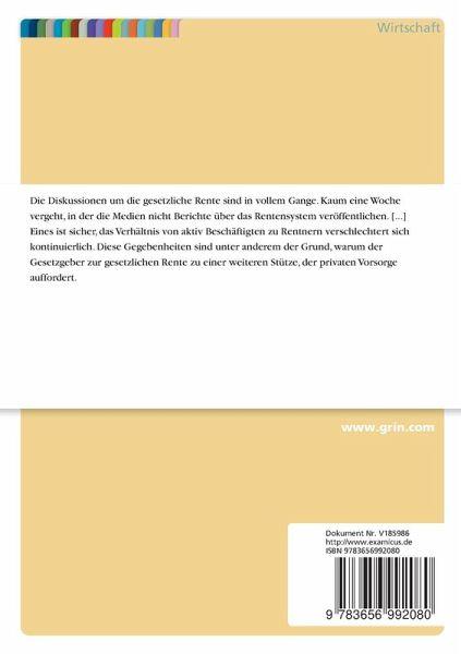 Studienarbeit aus dem Jahr 2001 im Fachbereich BWL - Bank, Börse, Versicherung, Duale Hochschule Baden-Württemberg, Ravensburg, früher: Berufsakademie Ravensburg, Sprache: Deutsch, Abstract: Die Diskussionen um die gesetzliche Rente sind in vollem Gange. Kaum eine Woche vergeht, in der die Medien nicht Berichte über das Rentensystem veröffentlichen. [...]Eines ist sicher, das Verhältnis von aktiv Beschäftigten zu Rentnern verschlechtert sich kontinuierlich. Diese Gegebenheiten sind unter anderem der Grund, warum der Gesetzgeber zur gesetzlichen Rente zu einer weiteren Stütze, der privaten Vorsorge auffordert.