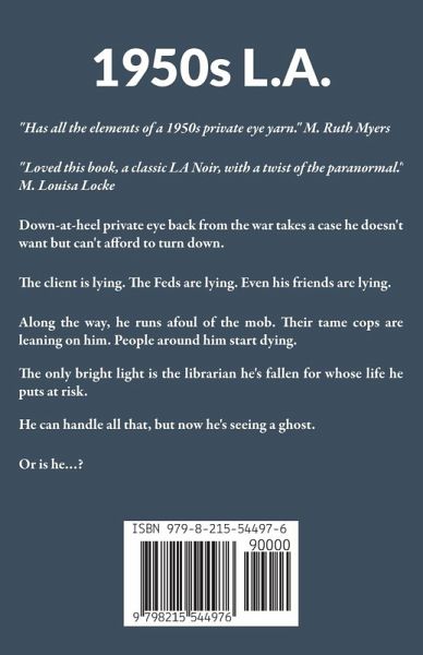 1950s L.A. Down-at-heel private eye back from the war takes a case he doesn't want but can't afford to turn down. The client is lying. The Feds are lying. Even his friends are lying. Along the way, he runs afoul of the mob. Their tame cops are leaning on him. People around him start dying. The only bright light is the librarian he's fallen for whose life he puts at risk. He can handle all that, but now he's seeing a ghost. Or is he…? "Has all the elements of a 1950s private eye yarn." M Ruth Myers "Loved this book, a classic LA Noir, with a twist of the paranormal." M Louisa Locke