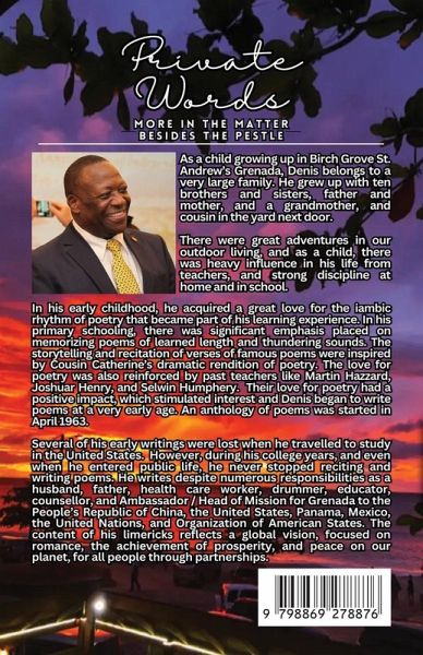 This book of poems "Private Words, more in the matter besides the pestle" is a revelation of a kind rhythm with cadences that comprise expressions, and delivery of speech, that generations of children like the author, grew up listening to, that keeps poetry very alive in author to this day. Growing up in a community in which learning was a family, and village mandate; and because families were close, we learned from each other. Among the past time events, were storytelling and recitation. Young children, mainly the boys, acquired auditory skills in an amusing way, as they listened to the unforgettable delivery of poetic lines, while sitting on Birch Grove bridge, or generally on the roots of the breadfruit tree in the yard. There were leading voices like my cousins Catherine, Flavian, and Francis Charles. Today Francis is better known as "Casa" for his unmatchable rendition of the great poem "Cassandra Bianca" by the English poet Felicia Dorothea Hemans. This poem commemorates an actual incident that occurred in 1798 during the Battle of the Nile between British and French fleets. The verses in this book are provoked by the culture of voice and articulation in which the author grew up, that lingers within him to this day. "Private Words, more in the matter besides the pestle" is a tribute to great poets past and present, and to all from my early years have intensified my love for poetry.
