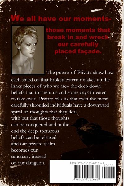 We all have our moments- those moments that break in and wreck our carefully placed façade. The poems of Private show how each shard of that broken exterior makes up the inner pieces of who we are- the deep down beliefs that torment us and some days threaten to take over. Private tells us that even the most carefully shrouded individuals have a downward spiral of thoughts that they deal with but that those thoughts can be conquered and in the end the deep, torturous beliefs can be released and our private realm becomes our sanctuary instead of our dungeon.