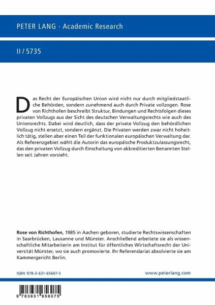 Das Recht der Europäischen Union wird nicht nur durch mitgliedstaatliche Behörden, sondern zunehmend auch durch Private vollzogen. Rose von Richthofen beschreibt Struktur, Bindungen und Rechtsfolgen dieses privaten Vollzugs aus der Sicht des deutschen Verwaltungsrechts wie auch des Unionsrechts. Dabei wird deutlich, dass der private Vollzug den behördlichen Vollzug nicht ersetzt, sondern ergänzt. Die Privaten werden zwar nicht hoheitlich tätig, stellen aber einen Teil der funktionalen europäischen Verwaltung dar. Als Referenzgebiet wählt die Autorin das europäische Produktzulassungsrecht, das den privaten Vollzug durch Einschaltung von akkreditierten Benannten Stellen seit Jahren vorsieht.