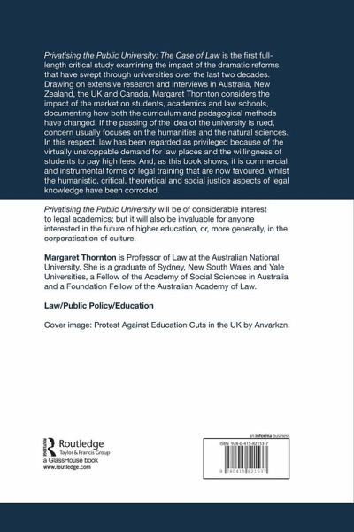 Privatising the Public University: The Case of Law is the first full-length critical study examining the impact of the dramatic reforms that have swept through universities over the last two decades. Drawing on extensive research and interviews in Australia, New Zealand, the UK and Canada, Margaret Thornton considers the impact of the market on students, academics and law schools, documenting how both the curriculum and pedagogical methods have changed. If the passing of the idea of the university is rued, concern usually focuses on the humanities and the natural sciences. In this respect, law has been regarded as privileged because of the virtually unstoppable demand for law places and the willingness of students to pay high fees. And, as this book shows, it is commercial and instrumental forms of legal training that are now favoured, whilst the humanistic, critical, theoretical and social justice aspects of legal knowledge have been corroded. Privatising the Public University will be of considerable interest to legal academics; but it will also be invaluable work for anyone interested in the future of higher education, or, more generally, in the corporatization of culture.