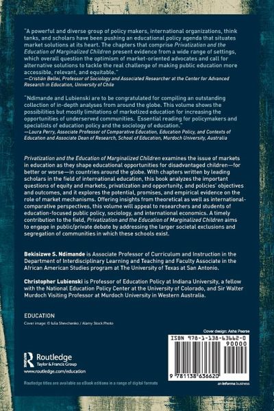 Privatization and the Education of Marginalized Children examines the issue of markets in education as they shape educational opportunities for disadvantaged children-for better or worse-in countries around the globe. With chapters written by leading scholars in the field of international education, this book analyzes the important questions of equity and markets, privatization and opportunity, and policies' objectives and outcomes, and it explores the potential, promises, and empirical evidence on the role of market mechanisms. Offering insights from theoretical as well as international-comparative perspectives, this volume will appeal to researchers and students of education-focused public policy, sociology, and international economics. A timely contribution to the field, Privatization and the Education of Marginalized Children aims to engage in public/private debate by addressing the larger societal exclusions and segregation of communities in which these schools exist.