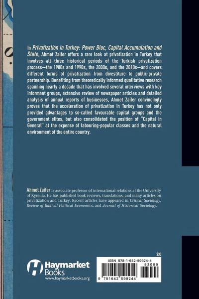 In Privatization in Turkey: Power Bloc, Capital Accumulation and State, Ahmet Zaifer offers a rare look at privatization in Turkey that involves all three historical periods of the Turkish privatization process -the 1980s and 1990s, the 2000s, and the 2010s- and covers different forms of privatization from divestiture to public-private partnership. Benefiting from theoretically informed qualitative research spanning nearly a decade that has involved several interviews with key informant groups, extensive review of newspaper articles and detailed analysis of annual reports of businesses, Ahmet Zaifer convincingly proves that the acceleration of privatization in Turkey has not only provided advantages to so-called favourable capital groups and the government elites, but also consolidated the position of Capital in General at the expense of labouring-popular classes and the natural environment of the entire country.