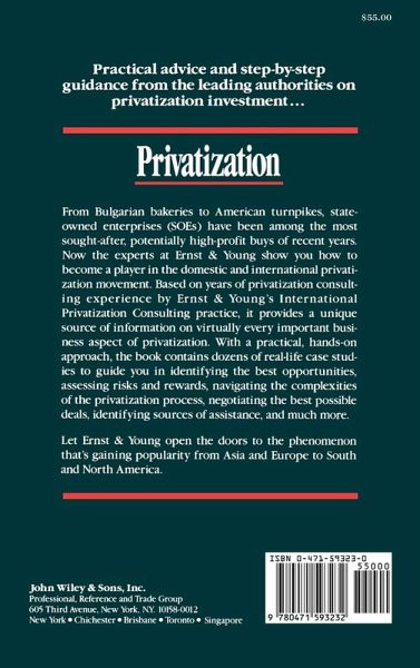 The public sector's need for new revenues, sparked by political change and economic pressures at home and abroad, has reversed the century-old trend toward government growth in favor of private sector management and ownership. Political upheaval in Eastern Europe, crippling debt in Latin America, and a volatile North American economy have created a climate in which privatization has emerged as a dramatic new business opportunity. While providing governments with a chance to cut losses and quickly generate much-needed cash, privatization offers new investment opportunities with strong upside potential for businesses. From news-making purchases involving Russian railroads and Brazilian agro-industries, to more modest investments, such as Romanian shoe factories and Texas grade schools, state-owned enterprises (SOEs) have consistently, proven to be among the most sought-after buys of the past decade. Based on years of privatization consulting by the professionals at Ernst & Young in Europe, Asia, Latin America, the U.S., and Canada, this new book provides practical guidance for involvement in and purchasing of state-owned enterprises. Combining principle with real-life case studies, this hands-on guide takes you step-by-step through the entire process - from research and planning to negotiating, purchasing, and managing.