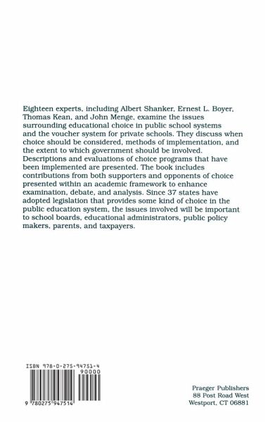 Eighteen experts, including Albert Shanker, Ernest L. Boyer, Thomas Kean, and John Menge, examine the issues surrounding educational choice in public school systems and the voucher system for private schools. They discuss when choice should be considered, methods of implementation, and the extent to which government should be involved. Descriptions and evaluations of choice programs that have been implemented are presented. The book includes contributions from both supporters and opponents of choice presented within an academic framework to enhance examination, debate, and analysis. Since 37 states have adopted legislation that provides some kind of choice in the public education system, the issues involved will be important to school boards, educational administrators, public policy makers, parents, and taxpayers.