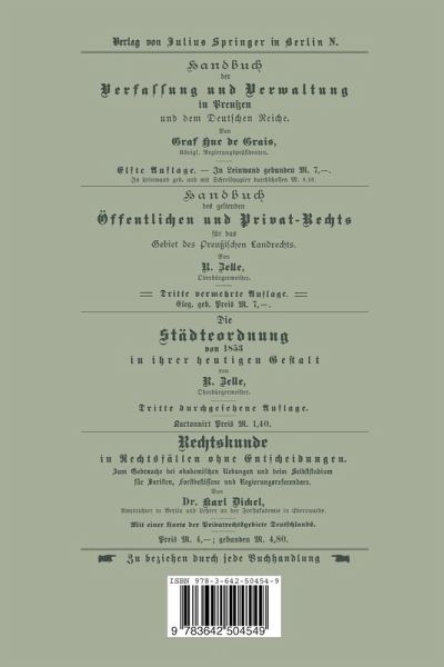 Inhaltsübersicht.- Theil I Umfang der polizeilichen Verfügungsmacht im Allgemeinen.- § 1. Die Polizeiverordnung.- § 2. Die Polizeiverfügung.- § 3. Gerichtliche Nachprüfung.- Theil II Beschränkungen des Privatrechts durch die Polizei.- § 4. Einleitung.- I. Polizei und Gemerbefreiheit.- Kapiel II. Polizei und Privateigenthum.- § 19. Das Prinzip.- III. § 25. Polizei und dingliche Rechte an frimder Sache.- IV. § 26. Polizei und obligatorische Berhältniffe.
