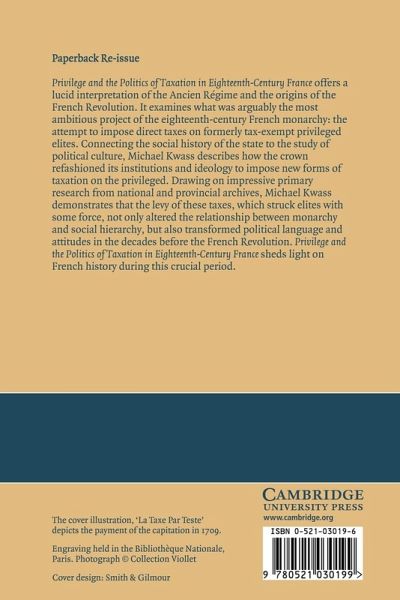 Privilege and the Politics of Taxation in Eighteenth-Century France offers a lucid interpretation of the Ancien Régime and the origins of the French Revolution. It examines what was arguably the most ambitious project of the eighteenth-century French monarchy: the attempt to impose direct taxes on formerly tax-exempt privileged elites. Connecting the social history of the state to the study of political culture, Michael Kwass describes how the crown refashioned its institutions and ideology to impose new forms of taxation on the privileged. Drawing on impressive primary research from national and provincial archives, Kwass demonstrates that the levy of these taxes, which struck elites with some force, not only altered the relationship between monarchy and social hierarchy, but also transformed political language and attitudes in the decades before the French Revolution. Privilege and the Politics of Taxation in Eighteenth-Century France sheds light on French history during this crucial period.