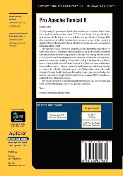 Pro Apache Tomcat 6 is ideal for Tomcat administrators and others who want to configure Tomcat. It covers only Tomcat 6 and doesn't get bogged down trying to overexplain tasks from each older version of the server. The book examines the entire installation, including file system, database, and web server, and provides you with security and performance tips.