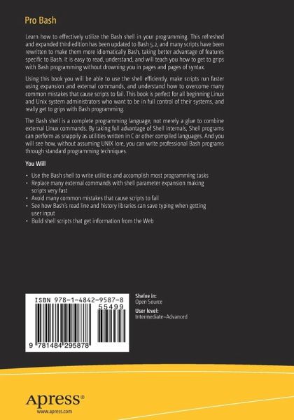Learn how to effectively utilize the Bash shell in your programming. This refreshed and expanded third edition has been updated to Bash 5.2, and many scripts have been rewritten to make them more idiomatically Bash, taking better advantage of features specific to Bash. It is easy to read, understand, and will teach you how to get to grips with Bash programming without drowning you in pages and pages of syntax.