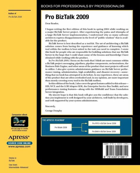 Readme.1st.- BizTalk in the Enterprise.- Starting a New BizTalk Project.- BizTalk Revealed.- Thinking Inside the Box.- Pipelining and Components.- Pipeline Component Best Practices and Examples.- BizTalk Design Patterns and Practices.- What the Maestro Needs to Know: Advanced Orchestration Concepts.- Playing By the Rules? Use the Business Rule Engine.- You Mean You Aren't a Developer?.- BizTalk Server 2009 Operations.- Deploying and Managing BizTalk Applications.- To Tune or Not to Tune? Nobody Should Ask That Question.- WCF Adapters: Standardizing Your Integration Endpoints.- WCF LOB Adapter SDK.- Host Integration Server 2009.- The Enterprise Service Bus Toolkit 2.0.