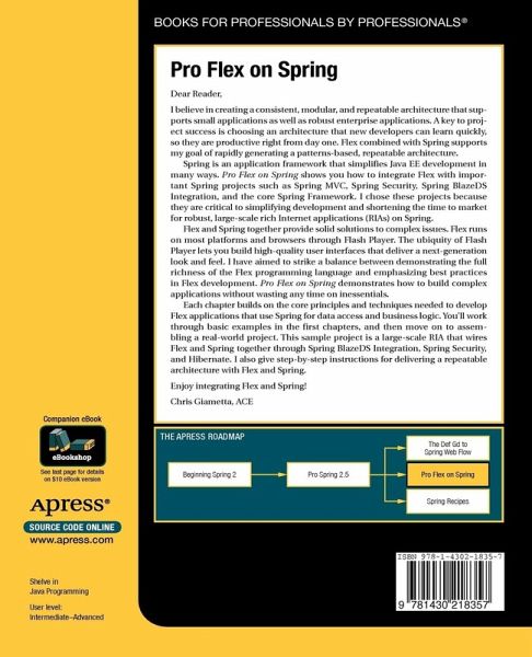 Rich Internet Applications with Flex and Spring.- Project Planning for Flex and Spring.- The Tools for the Job.- to Flex Applications.- to Spring.- Flex and Spring Integration Architecture.- Architecting the View: Cairngorm and PureMVC.- Data Persistence.- Security.- Flex, Spring, Cairngorm, Hibernate: Bringing It All Together.- Building the Database.- Building the Spring Services.- Building the Flex User Interface.- Porting the Flex Application to AIR.